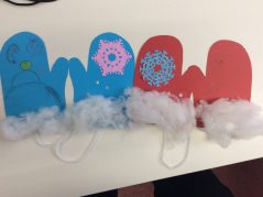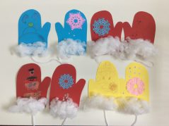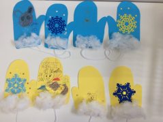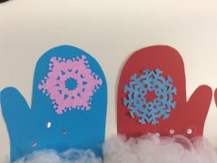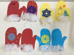 次に折り紙の雪の結晶と丸い形の折り紙をもう片方の手袋にのりで貼りました❄️